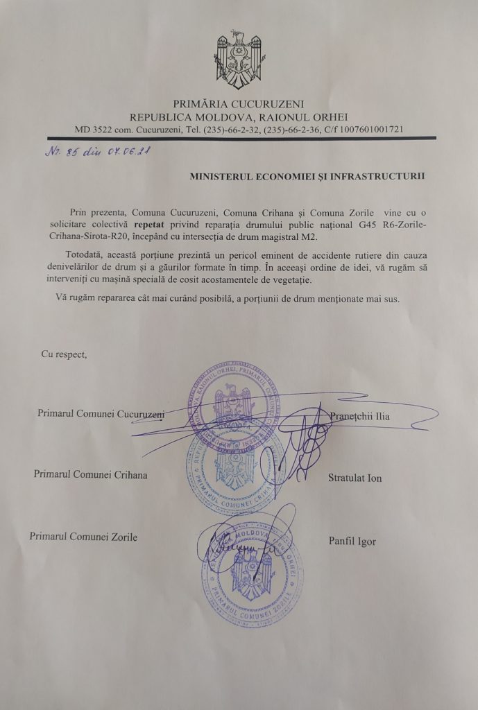 și a comunelor vecine, Comuna Zorile și Comuna Crihana, în mod repetat am solicitat repararea drumului public național G45 R6-Zorile-Crihana-Sirota-R20. Din păcate acest drum nu este în gestiunea Primăriilor, dar a Statului de care răspunde Î.S. Administrația de Stat a Drumurilor. Primăria comunei Zorile Primăria comunei Crihana